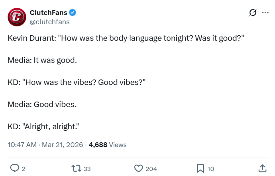 在打出这样的表现,率队大胜老鹰终结对手11连胜后,杜兰特赛后面对记者时主动提问自己本场与队友的肢体语言怎么样?球队氛围好不好?