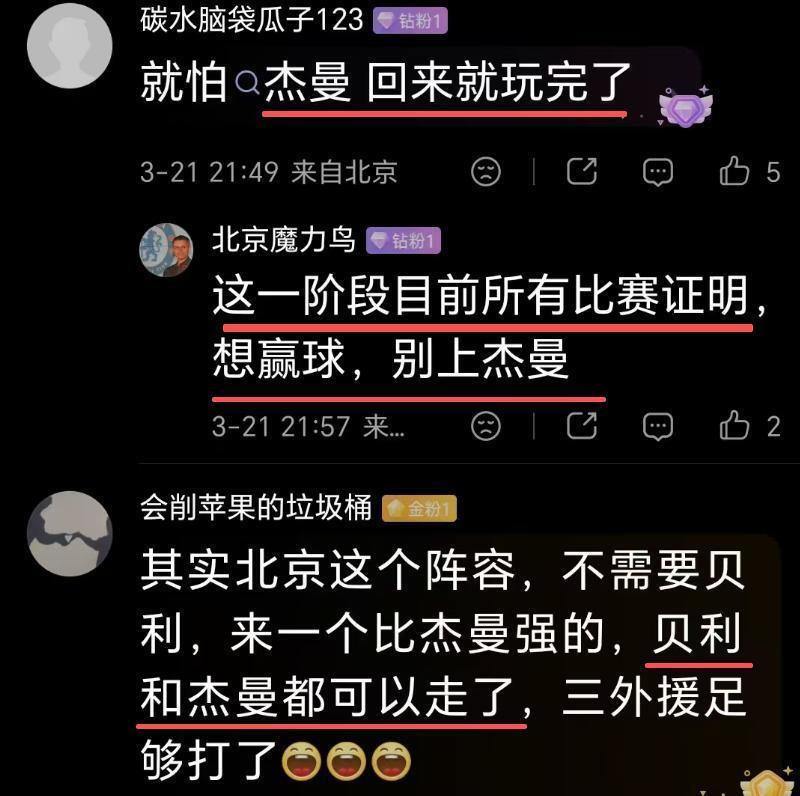 球迷说,“第四节真的不用死磕杰曼 ,上斯佩尔曼可以给两位拉开空间他们就打得更舒服了”、“这一阶段目前所有比赛证明想赢球,别上杰曼”。这场胜利也找到了脓包,球迷说:“脓包找到了,杰曼”。甚至有些球迷主张裁掉杰曼:“其实北京这个阵容,不需要贝利,来一个比杰曼强的,贝利和杰曼都可以走了,三外援足够打了”。