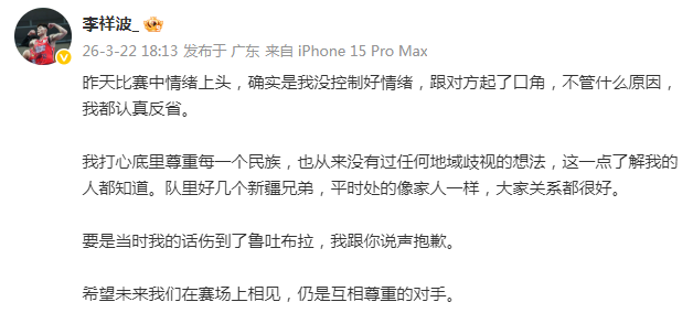 “昨天比赛中情绪上头,确实是我没控制好情绪,跟对方起了口角,不管什么原因,我都认真反省。”李祥波在社媒上写道。