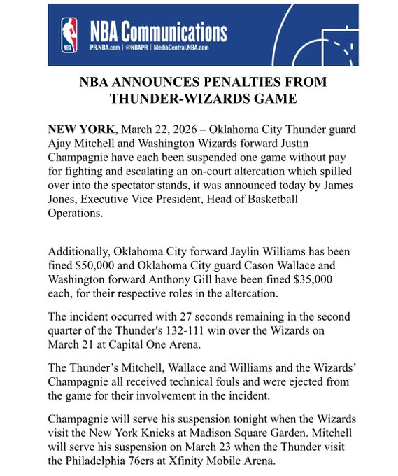 北京时间3月23日,NBA官方发布公告宣布,由于在周日两队的冲突事件中涉事,奇才队前锋贾斯汀-尚帕涅和雷霆队后卫阿贾伊-米切尔各被禁赛一场。联盟声明称,尚帕涅和米切尔因在场上发生冲突、激化斗殴行为,且冲突蔓延至观众席,被处以无薪禁赛。除两人遭禁赛外,雷霆内线球员杰林-威廉姆斯被罚款5万美元,雷霆后卫卡森-华莱士和奇才前锋安东尼-吉尔各被罚款3.5万美元,三人累计被罚12万美元。
