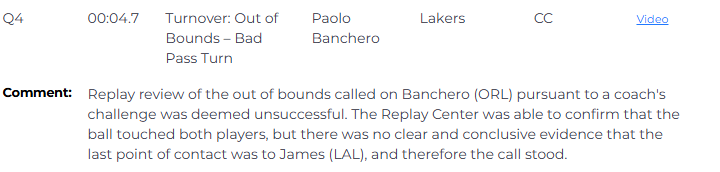 官方解释争议判罚:比赛最后4.7秒,魔术挑战对班凯罗出界的判罚,回放审查结果判定挑战失败。回放中心确认球触及了双方球员,但没有清晰且确凿的证据表明最后触球点是詹姆斯,因此维持原判。