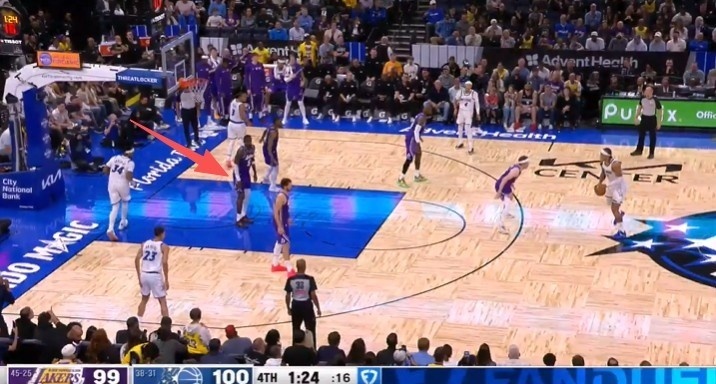 比赛最后1分22秒,艾顿在油漆区停留时间超过三秒,且未处于积极防守对方球员的状态,漏吹艾顿3秒违例,湖人获利,魔术吃亏。