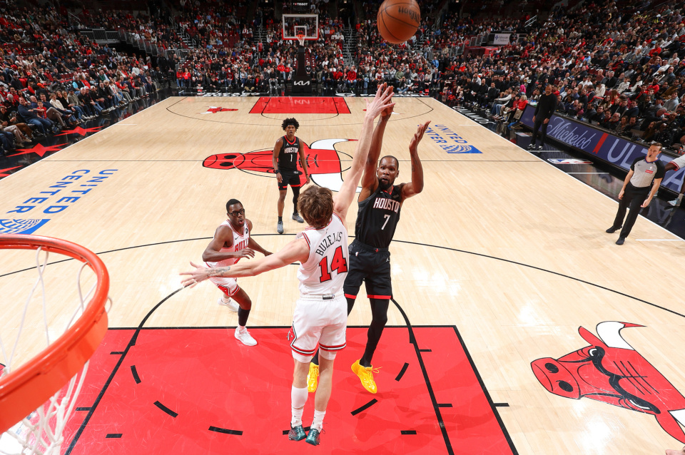 首节比赛,杜兰特上来就急停跳投命中,为火箭取得首次运动战进球。公牛坐镇主场持续打出反击攻势,以一波19-4的进攻高潮压制火箭,两队分差迅速来到双位数。火箭尝试多点开花予以回应,杜兰特持续攻筐试图给对手制造压力,但是火箭的防守过于糟糕,给到对手轻松获得空位机会,火箭在首节丢41分并且被对手拉开分差到20分。