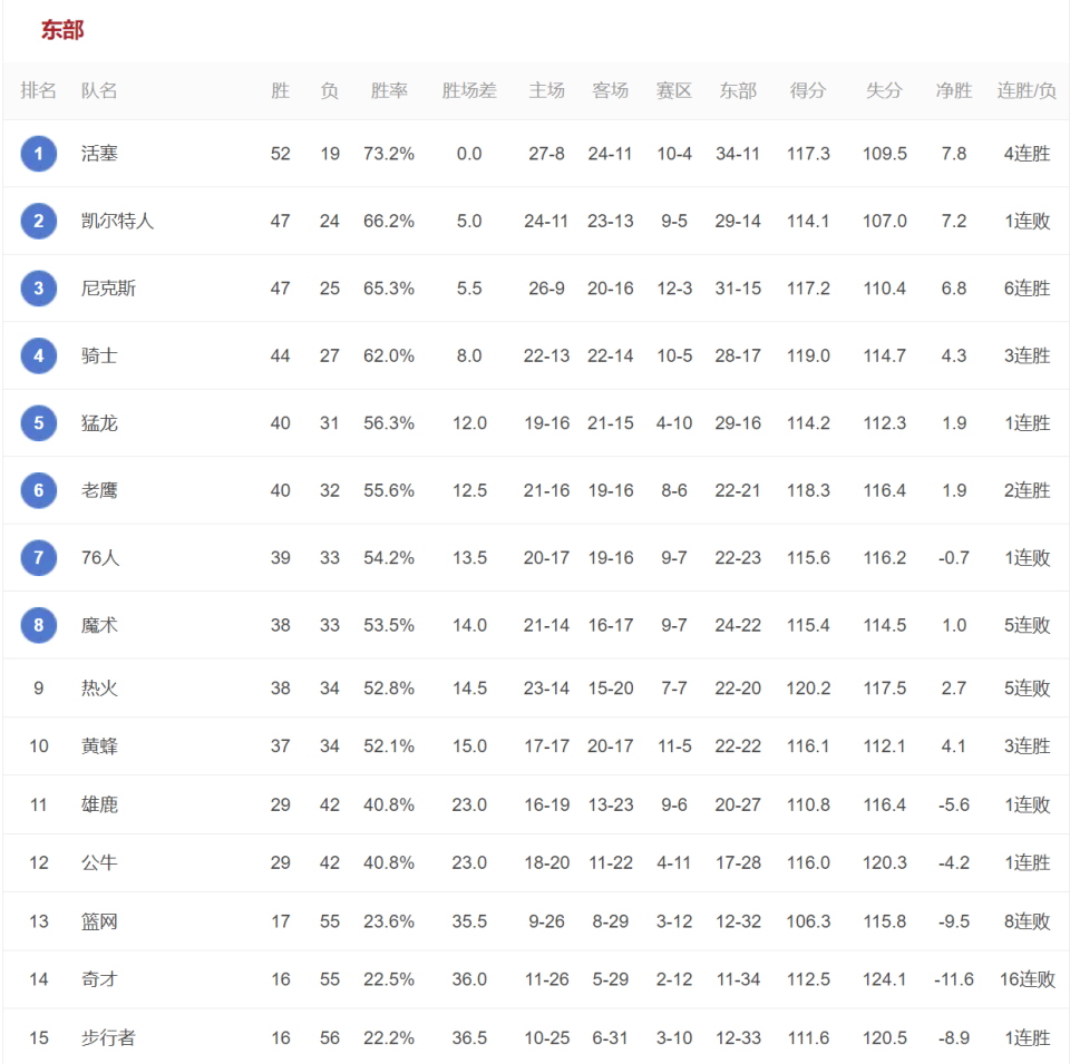 截至今天赛前,76人39胜33负排名东部第七,领先第八的魔术0.5个胜场,落后第六的老鹰1个胜场。乔治说:“我们目前的位置依然不错!我会把最后这10场常规赛当成季后赛来打,我们要带着必须赢的心态去拼,稳住一个好排名。”