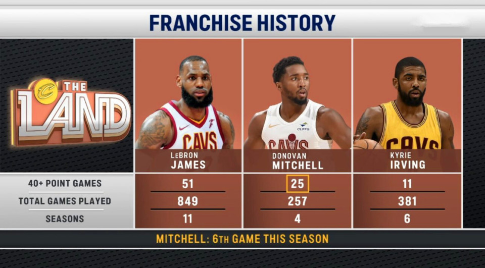 这是米切尔本赛季第6次拿下40+追平杰伦布朗并列联盟第4,同时米切尔骑士生涯第25次砍下40+高居队史第二,仅次于詹姆斯的51场,也是生涯第34次40+追平韦德并列历史第36名。