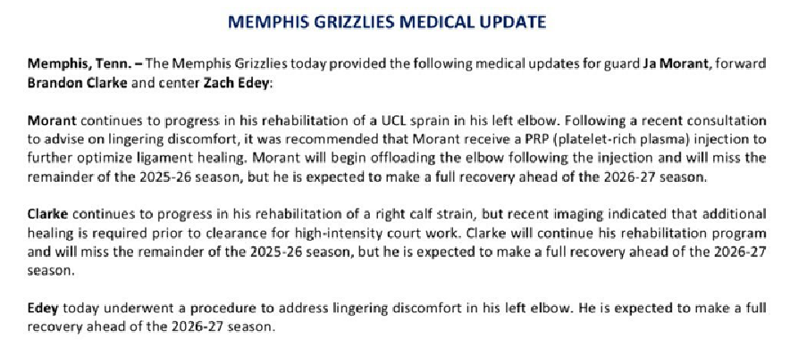 灰熊官方宣布:莫兰特因左肘尺侧副韧带(UCL)扭伤提前结束本赛季征程,预计26-27赛季开始前完成康复......
