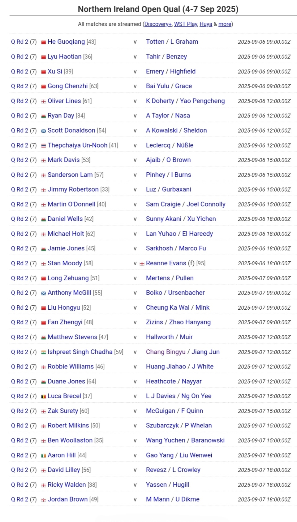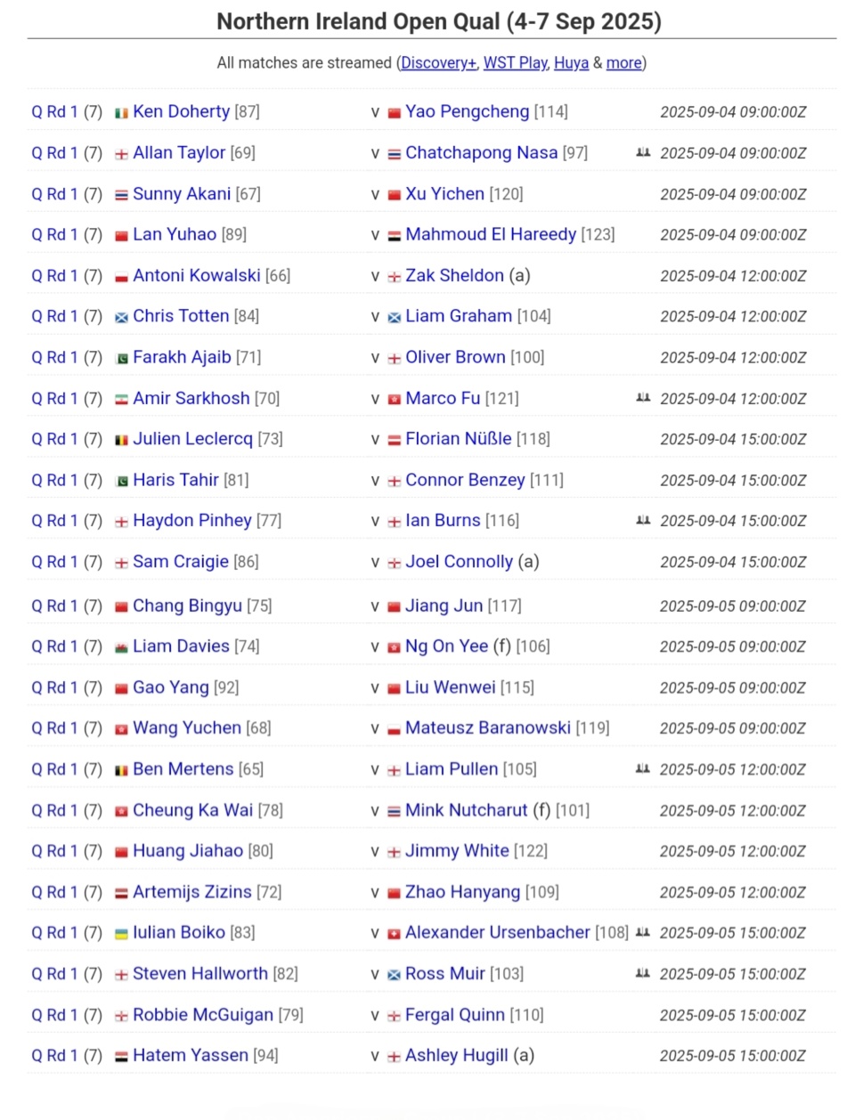 北京时间9月2日11时,世界斯诺克职业巡回赛WST官网,发布了2025斯诺克北爱尔兰公开赛资格赛阶段两轮,暨128进96轮次和96进64轮次的完整赛程。