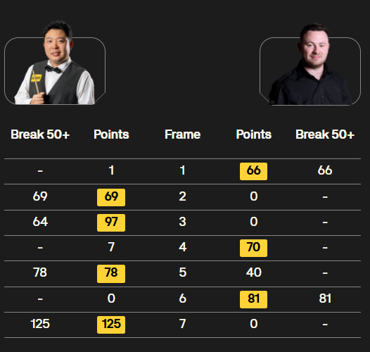率先上场的吴宜泽打出一杆破百和两杆50+,4-0横扫庞俊旭。