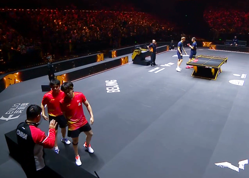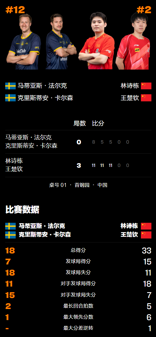 比赛开始后,瑞典组合率先发动,打出了较高质量的回球强行破防,但王楚钦/林诗栋很快便以5-1反超对手,随后法尔克/卡尔森开始追分但依旧不断落后,而且卡尔森还因为发球斜抛而被罚分,挑战鹰眼也失败,国乒选手抓住机会以9-4、10-6领先,紧接着虽然错失2个局点,但最终还是以11-8成功拔得头筹。