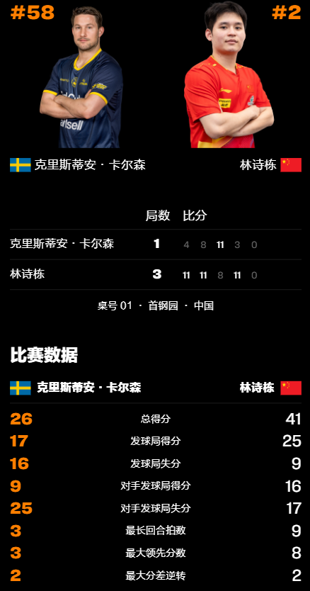 在自己第二局赛点局,林诗栋没有再给卡尔森机会,上来就轰出9-1,在气势上压制住了对手,并且扛住了对手的反扑,轻松以11-3锁定胜局。