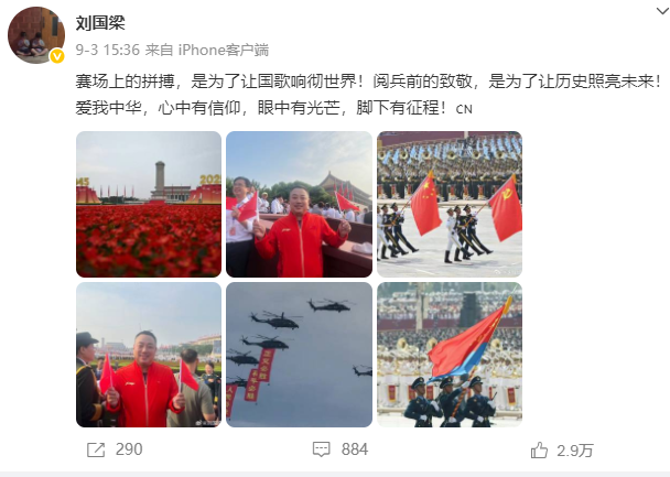 翻看一下刘国梁近期的动态,最近的是9.3阅兵,刘国梁手举国旗,非常激动和感慨。