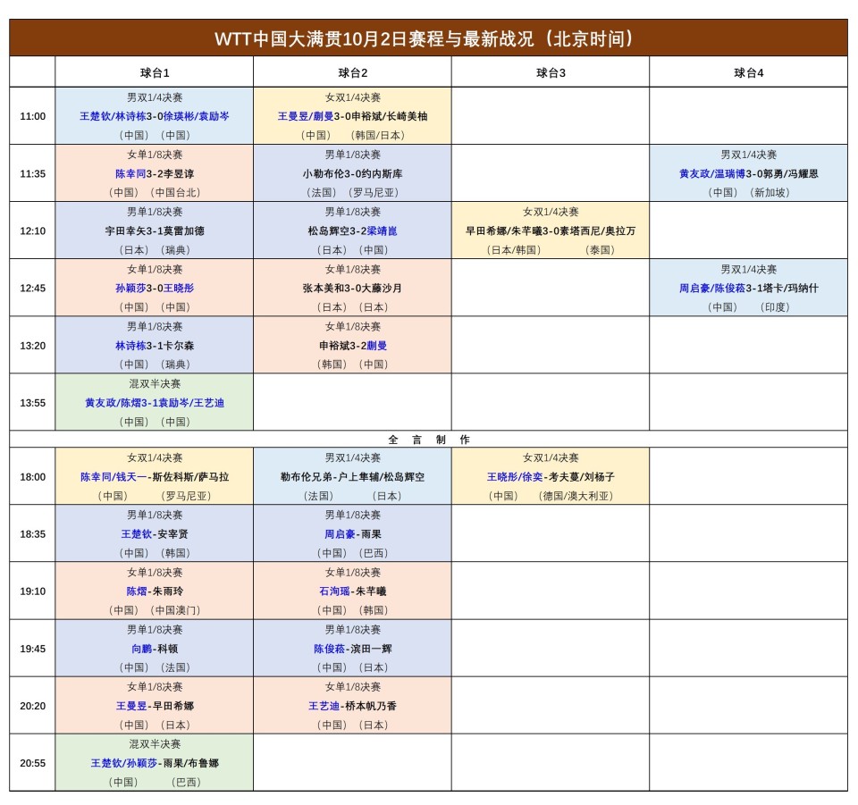 WTT中国大满贯赛10月2日的比赛安排有男女单打1/8决赛、双打1/4决赛以及混双半决赛,如前所说,国乒总计爆发了3场队内大战,其中孙颖莎3-0轻取王晓彤晋级女单8强,王楚钦/林诗栋也是3-0胜出、淘汰徐瑛彬/袁励岑晋级男双4强。