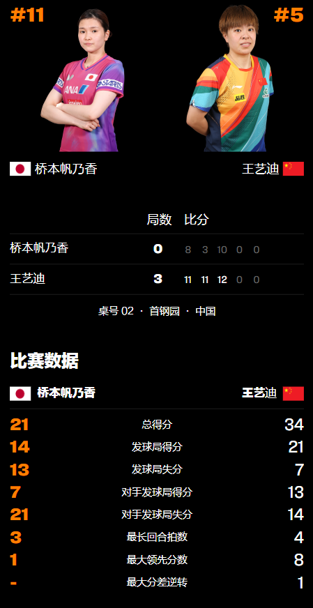 本场比赛王艺迪打得非常有耐心,始终在场上压制着桥本帆乃香,最终直落三局以大比分3-0获胜,打破了自己面对桥本的不胜魔咒!