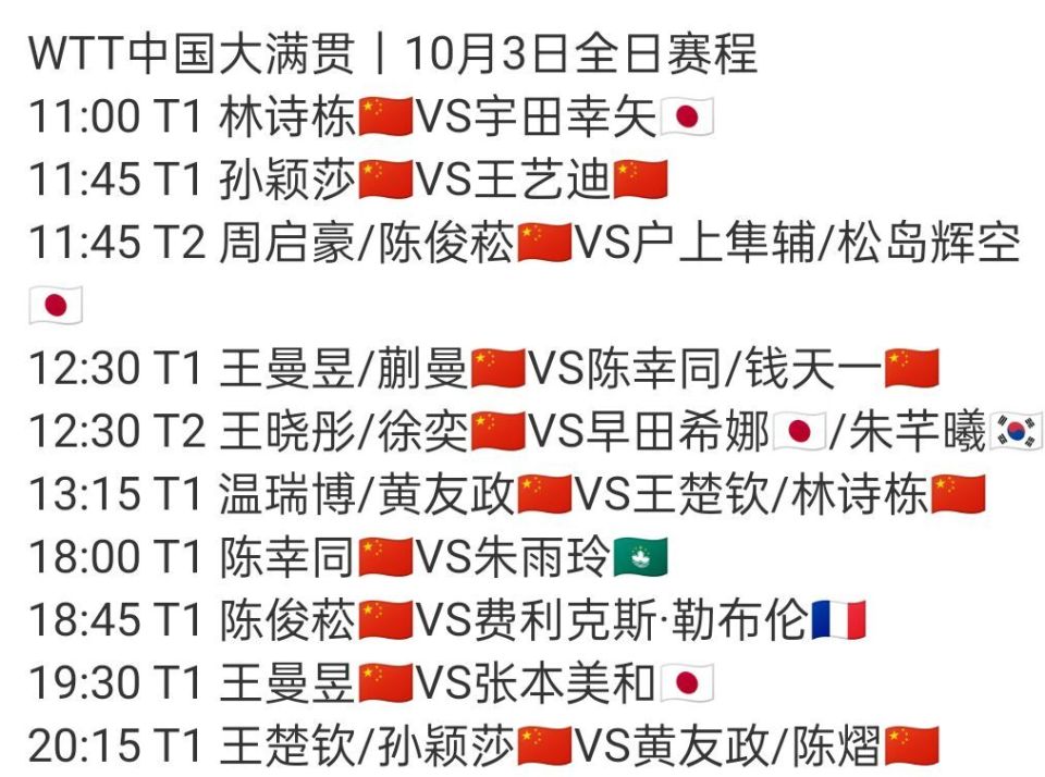 WTT中国大满贯:国乒10月4日赛程公布!将诞生首冠,王楚钦已错开