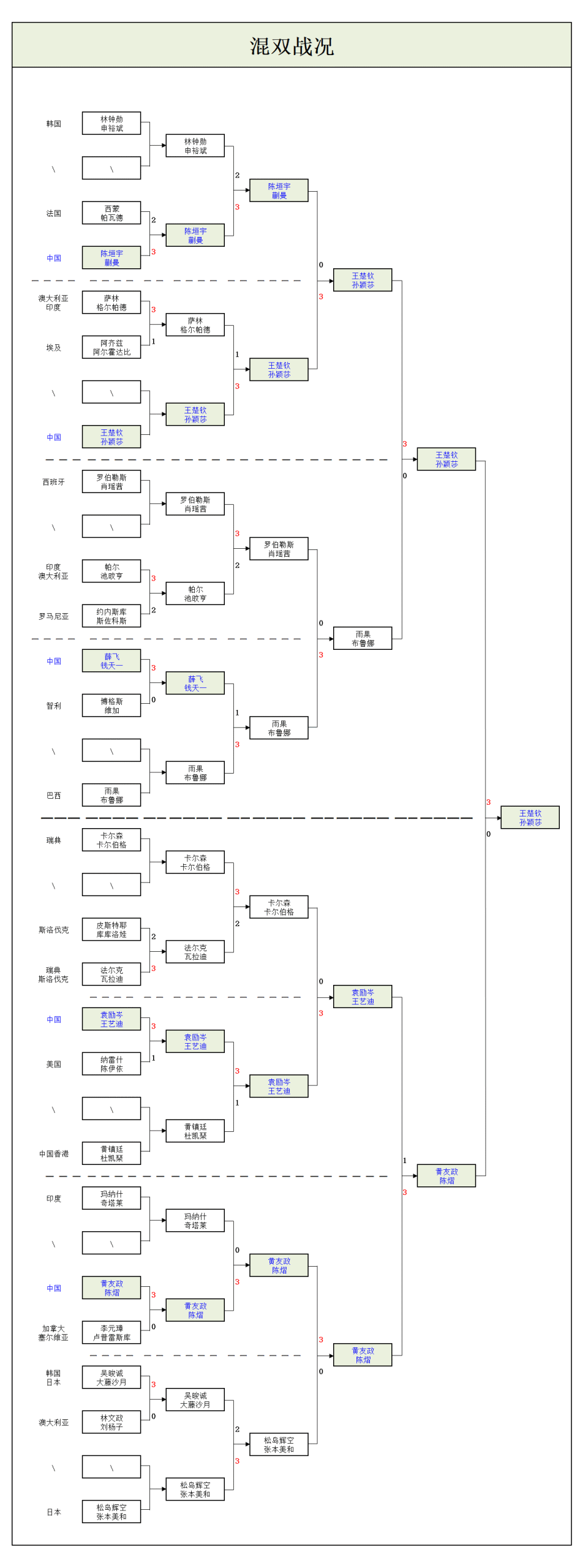 本站比赛虽然尚未结束,但总体形势已经逐渐明朗。与去年相比,混双成绩没有退步,仍然是3对组合入围半决赛,最后成功包揽冠亚军,其中决赛是“莎头”组合——王楚钦/孙颖莎3-0打败新人配对黄友政/陈熠,再次捍卫了自己在这个项目上的绝对统治力,详细战况如下: