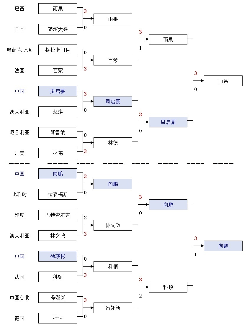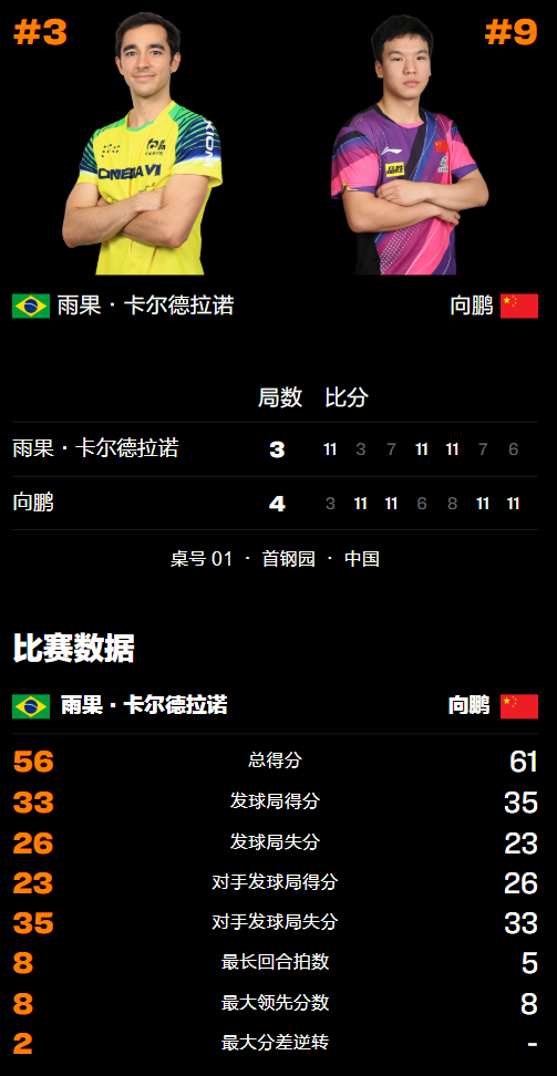 比赛开始后,向鹏率先发动2-0领先对手,但很快便被雨果的大力弧圈球压制连丢3分,紧接着追至3-3后又陷入被动,强行侧身后正手位暴露出了太大的空档被突破,随即连丢8分以3-11败北,无缘拔得头筹。