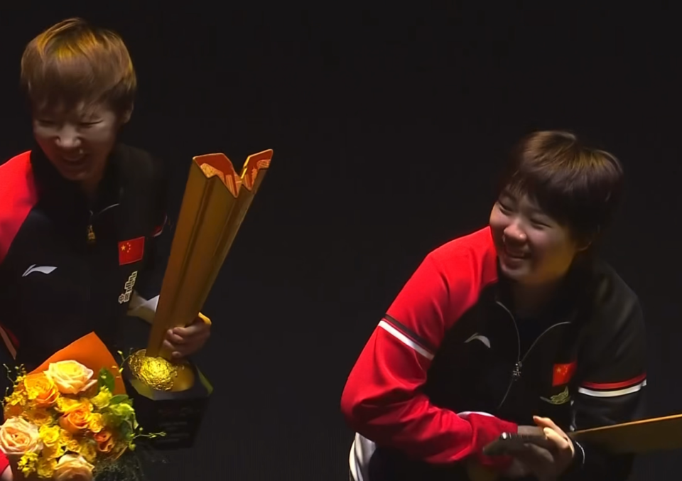 等王曼昱/蒯曼上来,她们两个就非常淡定了,没有什么过多的表情。因为之前都庆祝过了,也不用太嚣张,所以在拿到奖杯的时候,也没有什么夸张的动作,这也展现了她们两个的低调。