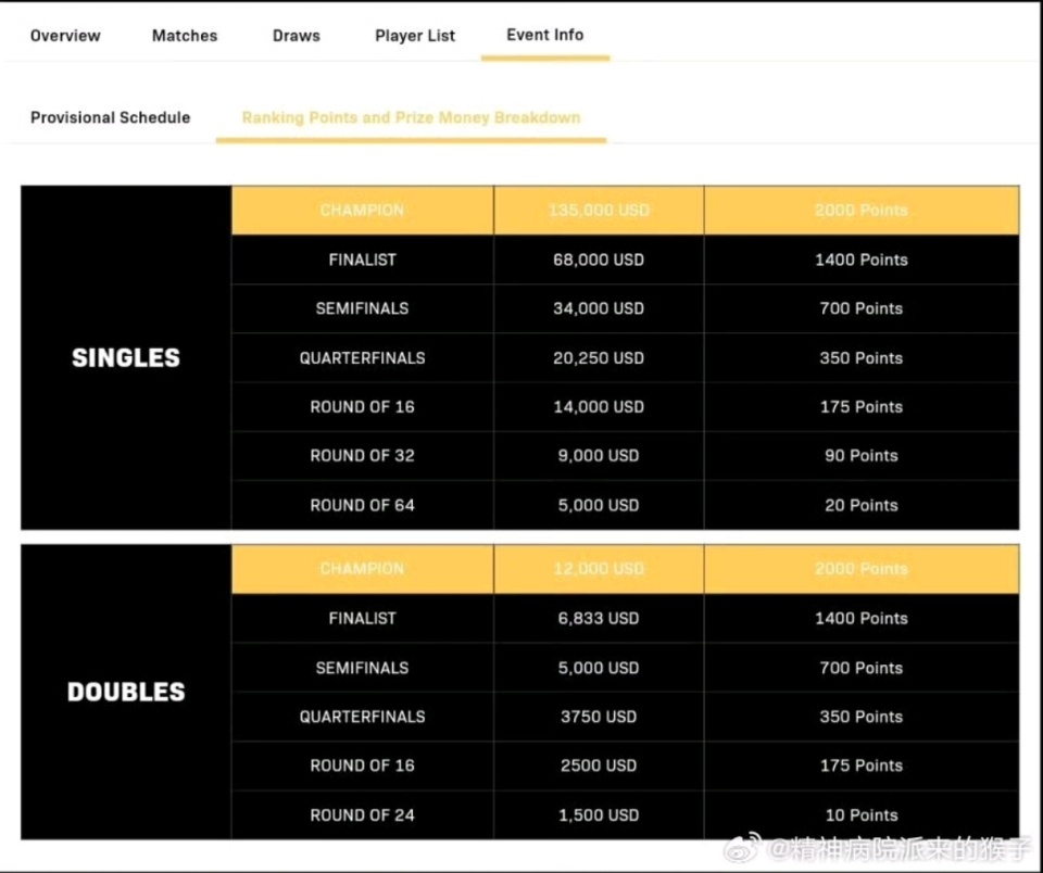 今年的中国大满贯奖金池总额205万美元,创造历史纪录。其中双打(男双、女双、混双)的冠军奖金是1.2万美元,两个人平分,每人就是6000美元;单打冠军奖金则达到13.5万美元。