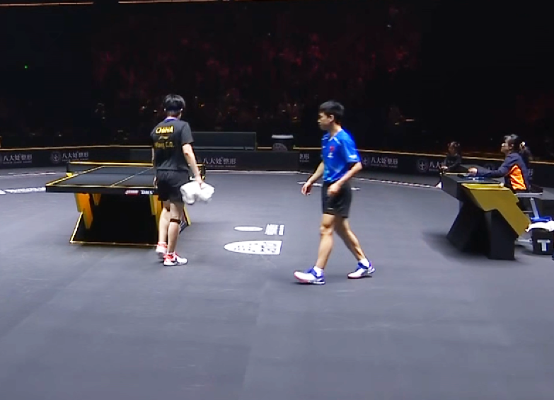 第五局王楚钦并未轻言放弃,上来就率先发动先得1分,但向鹏很快便追平。面对队友的强势进攻,王楚钦在3-3后打出了一波小高潮,很快便连得8分、以11-3取得胜利,由此而再追一局缩小与向鹏之间的差距,但在场上还是显得比较疲劳。