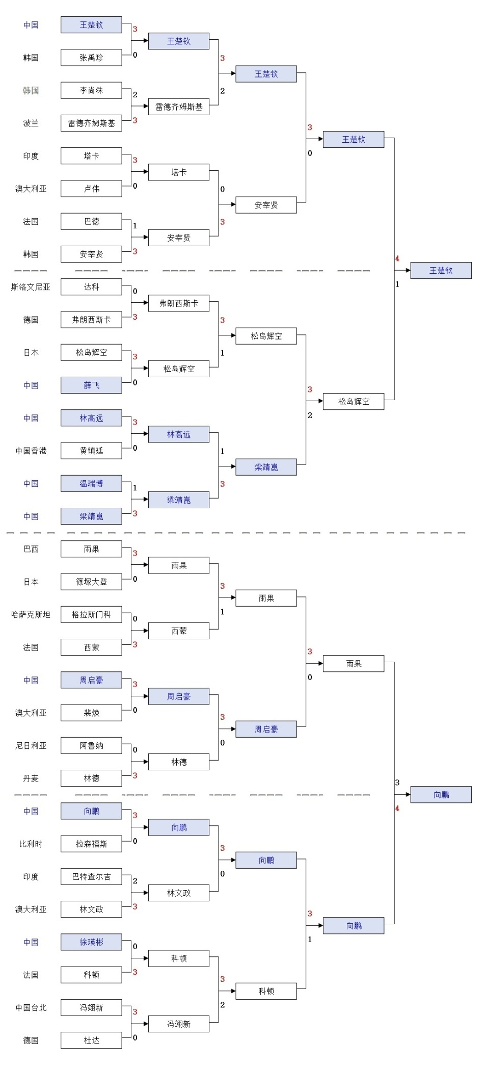 第七局向鹏再次取得领先优势,但王楚钦在2-6落后的情况下奋起反击追至7-7,随后再得1分反超但紧接着又8-9落后,关键时刻王楚钦连得2分以10-9拿到赛点,再赢1分后以11-9锁定胜利,由此而实现大逆转晋级男单决赛,距离“三冠王”头衔仅一步之遥。