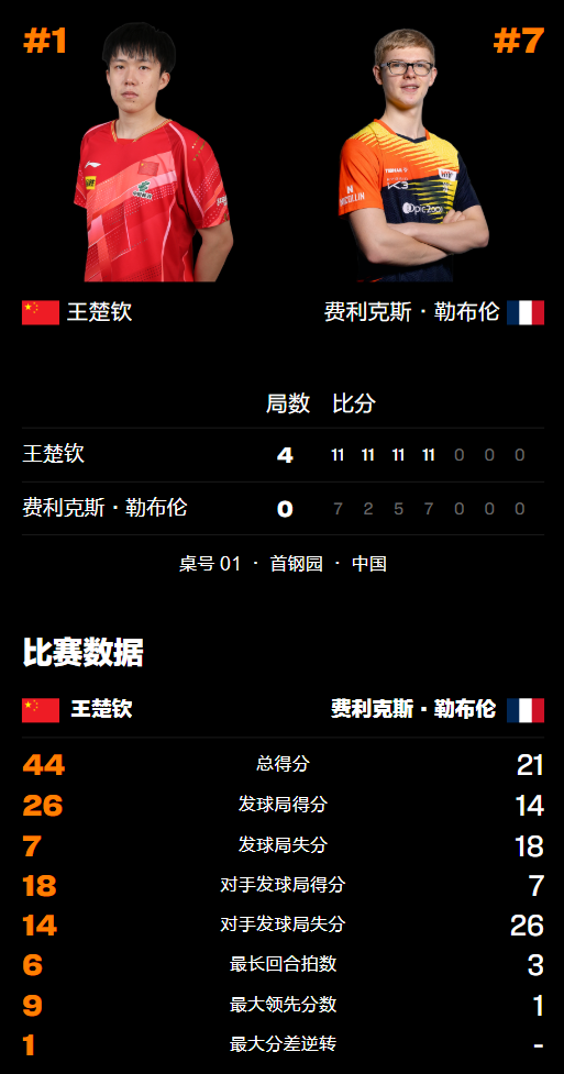 比赛开始后,王楚钦在首局便迅速进入状态,没有因为半决赛的苦战而出现疲态,很快便6-1、9-3领先小勒布伦,错失3分后赢1球10-6拿到局点,最终以11-7成功拔得头筹。