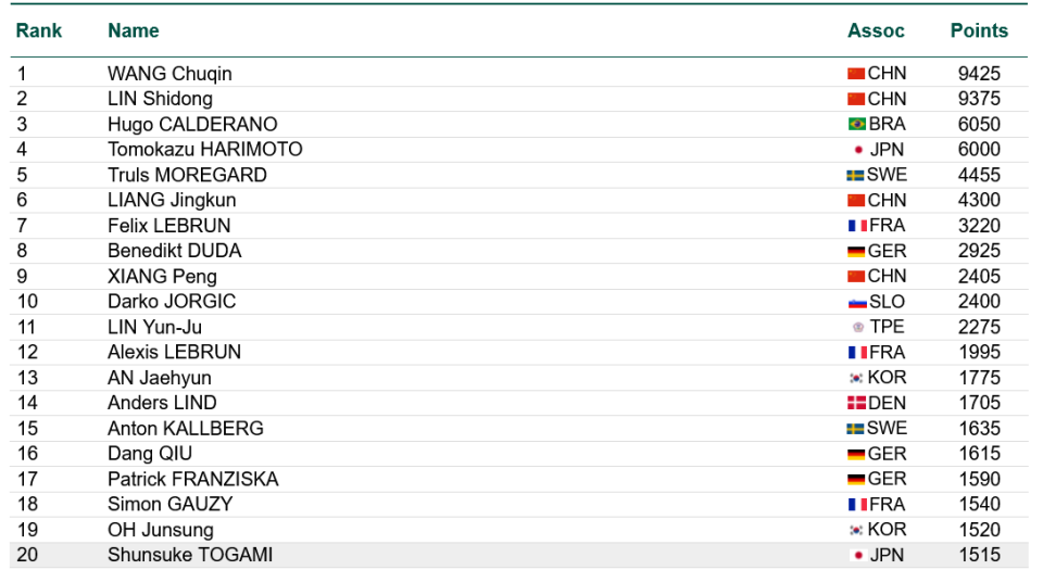 王楚钦坐稳世界第一!10900分破男单世排纪录,梁靖崑落到第七