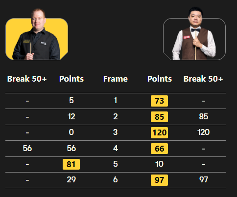 短休后,布朗拿到一局。第6局,布朗失误后,丁俊晖一杆97分清台,5-1终结比赛。