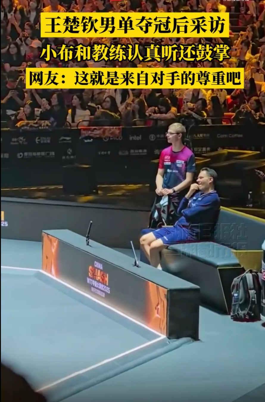 10月6日消息,10月5日晚上,在WTT中国大满贯男单决赛中,王楚钦以4比0击败法国名将菲利克斯-勒布伦,获得2025WTT中国大满贯男单冠军。本次比赛,王楚钦身兼三项非常辛苦,赛后当王楚钦采访时,对手勒布伦认真聆听,并且为他鼓掌喝彩!