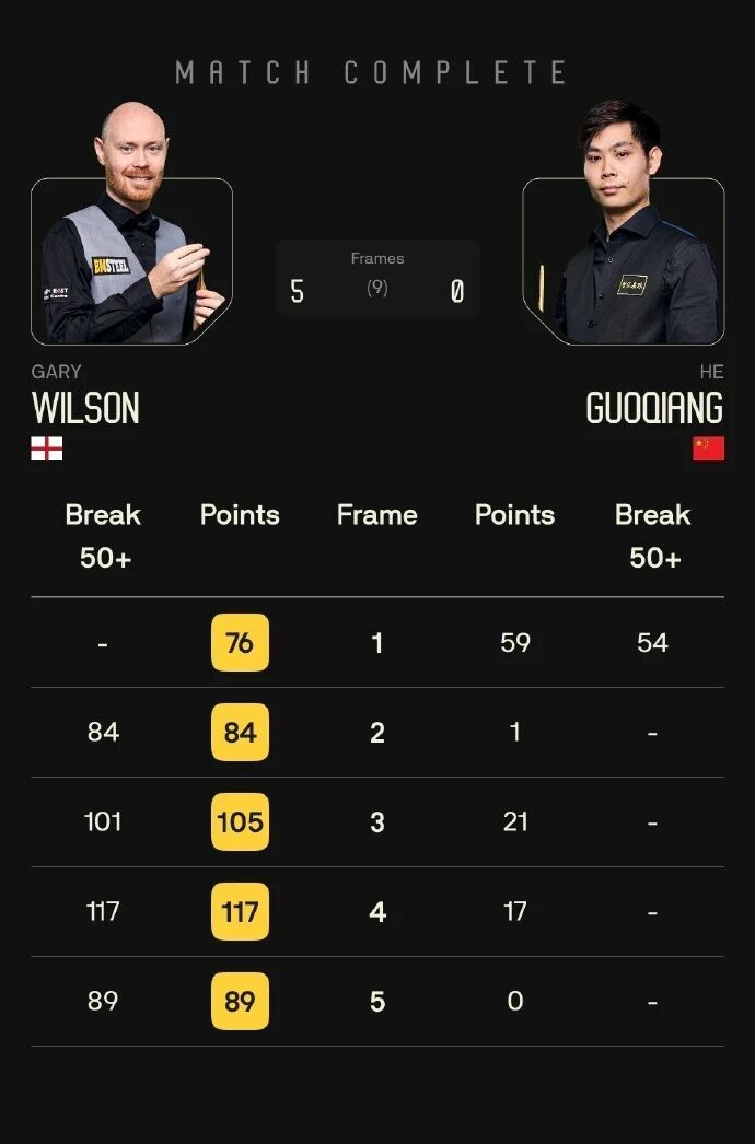 贺国强对阵的哥加里-威尔逊。首局,贺国强单杆54分后打丢红球,后面安全球失误,加里逆转。此后,贺国强多有失误,加里连续一杆制胜,打出两杆破百和两杆80+,5-0零封晋级。贺国强阻击失利后,宣告西安大奖赛结束后,斯佳辉世界排名将跌出前16。