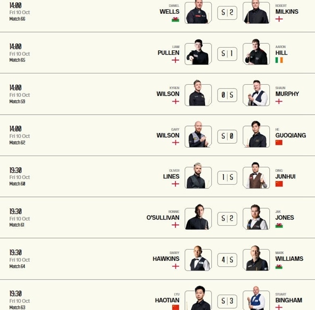这一比赛日结束的其余五场1/8决赛:奥沙利文5-2杰克琼斯,马克威廉姆斯5-4巴里霍金斯,卫冕冠军凯伦威尔逊0-5惨败于墨菲,丹尼尔威尔斯5-2米尔金斯,利亚姆普伦5-1亚伦希尔。
