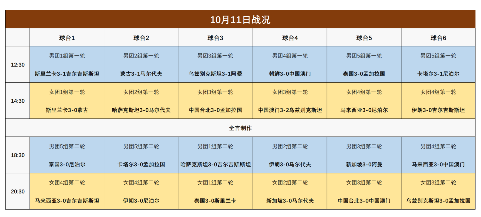 而在10月11日的亚锦赛较量中进行了24场小组对决,朝鲜男团、中国台北女团等实力较强的队伍有亮相,暂时没有被爆出冷门,以下为详细比分: