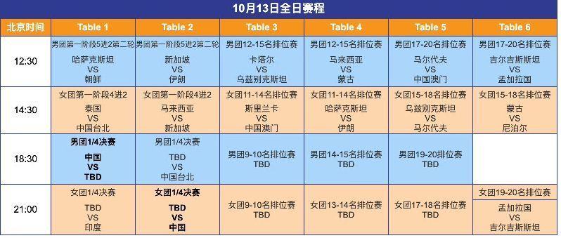 乒乓球亚锦赛:10月13日赛程公布!将诞生全部四强,国乒终于登场