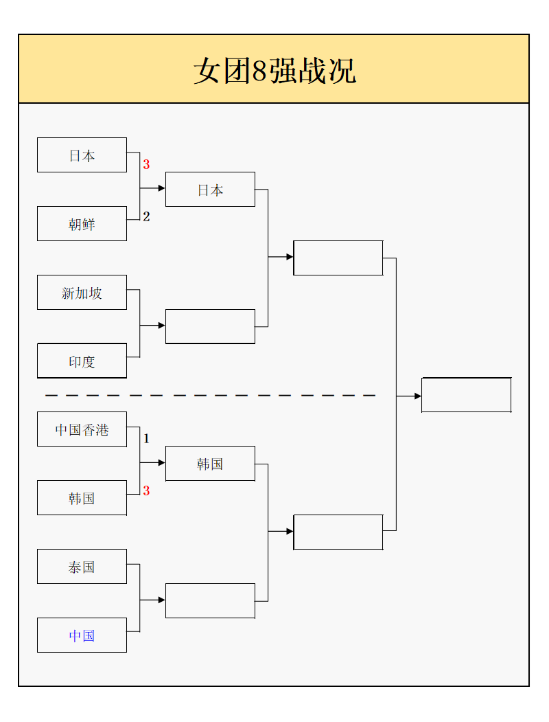 而在第一阶段淘汰赛开打前,已经有4支8强球队在10月12日晚结束1/4决赛的战斗,其中卫冕冠军日本队苦战5盘3-2险胜“神秘之师”朝鲜,韩国队则是3-1战胜中国香港,详细比分如下: