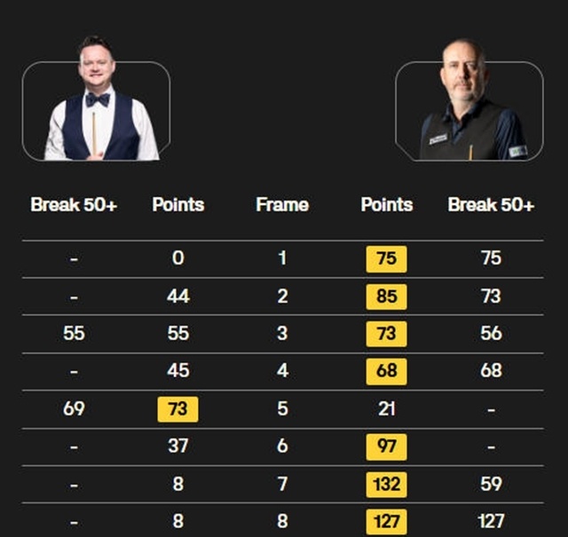 经过短暂的中场休息调整,墨菲终于在下半场一上来就拿下了一局胜利,打出单杆69分以73-21扳回一局追到1-4。不过,墨菲没能延续自己的势头,马克威廉姆斯凭借多次上手以97-37拿下第六局5-1保持领先。接下来,马克威廉姆斯又连轰单杆59分、127分拿下第七局和第八局,最终7-1遥遥领先墨菲结束第一阶段。