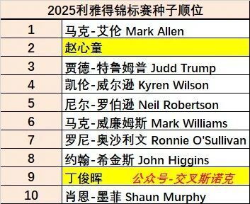 2025年斯诺克西安大奖赛结束后,参加今年沙特利雅得斯诺克锦标赛的10位职业球员,全部敲定,中国两位球员入选,赵心童和丁俊晖。