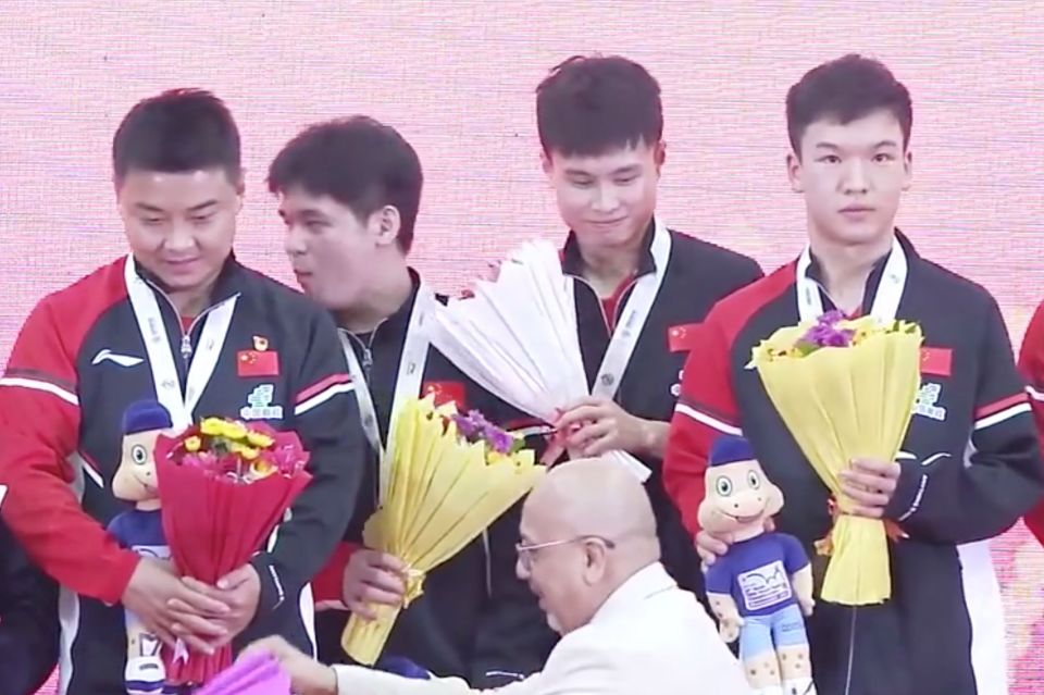 10月15日晚,印度乒乓球亚锦赛闭幕,中国男团实现3连冠。在颁奖仪式上,印度主办方再次闹出尴尬,他们给球员颁发的鲜花和娃娃疑似已多次循环使用。