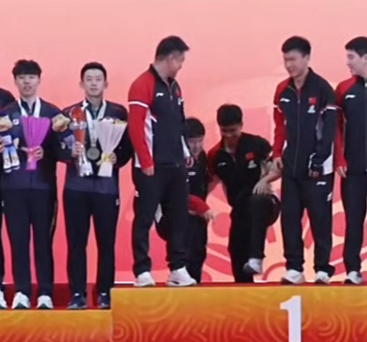 最后是冠军国乒男团领奖。这里就出现了一个有趣的事情。按照惯例,冠军队员与季军和亚军握手后,再登上冠军领奖台。王楚钦走在最前面,后面跟着四位队友和教练王皓。这都没什么问题。可当他们登上领奖台时,就出现了问题。王楚钦走在最前面,就站在了领奖台的最右边。梁靖崑挨着王楚钦。王皓跟在梁靖崑后面,不过他没有站在梁靖崑旁边。如果他站在梁靖崑旁边,就是C位了。王皓偏偏站在最左边。教练都是这样站位。王皓也没问题。