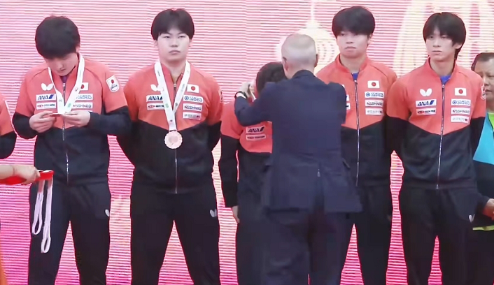 赛后进行了颁奖典礼。日本男乒和中国台北男乒获得季军。嘉宾先给他们颁奖。