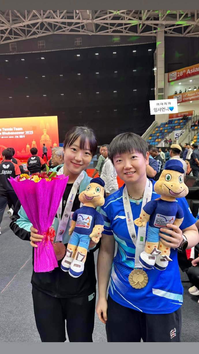 本次比赛,中国队获得冠军,日本队获得亚军,韩国队获得季军,在颁奖仪式上,韩国队一姐申裕斌也主动追星了孙颖莎,申裕斌佩戴着铜牌和金牌得主孙颖莎一同合影,莎莎笑容灿烂。