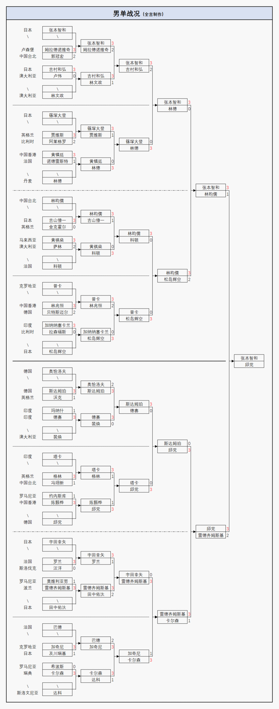 张本智和:3-2姆拉德诺维奇(卢森堡)、3-2吉村和弘(日本)、3-0林德(丹麦)、3-1林昀儒(中国台北)。