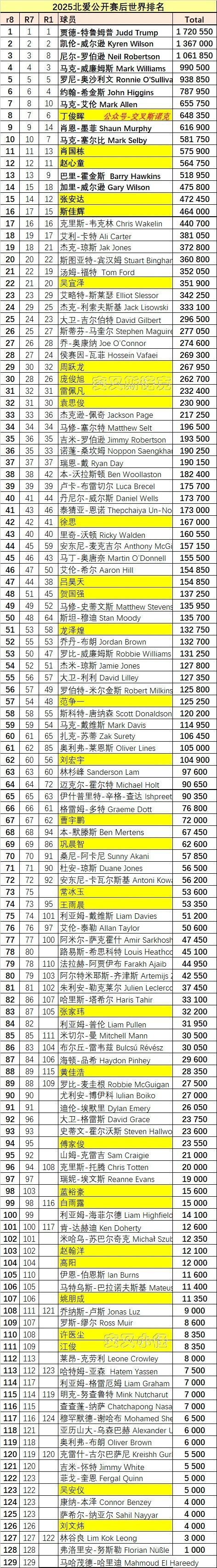 具体排名如下:(排名最终以世界斯诺克官网公布的为准)
