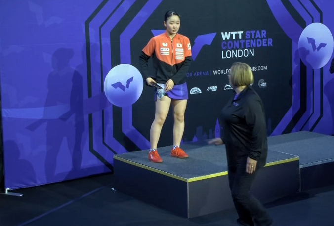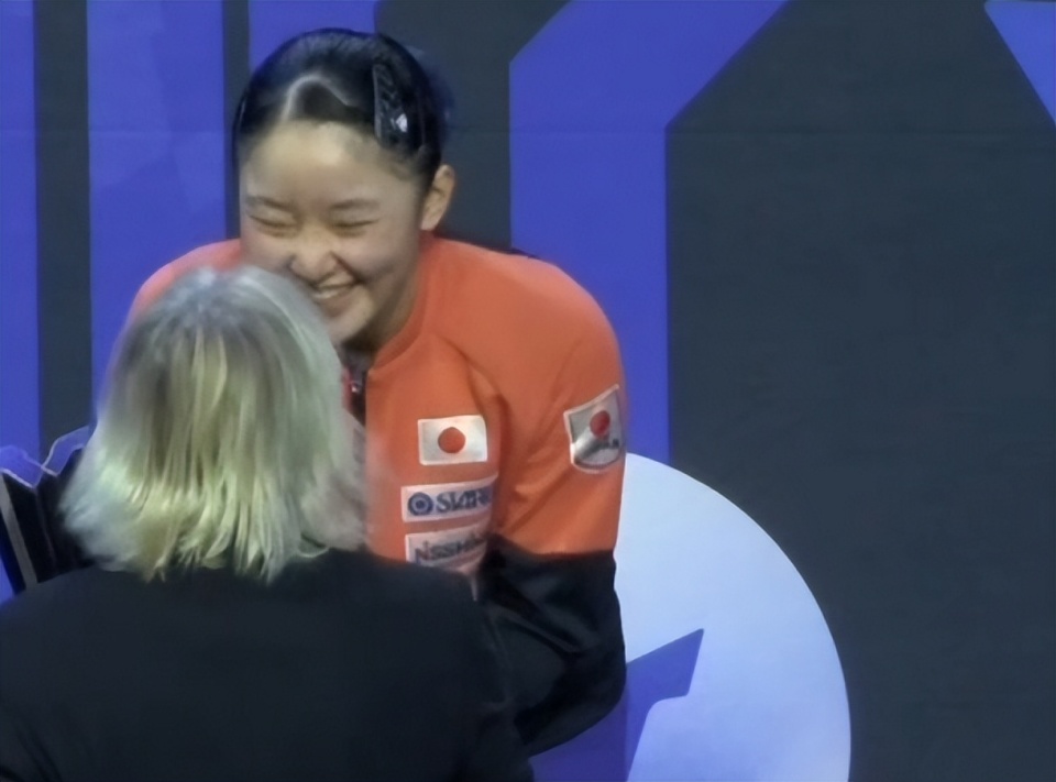 获得女单亚军的早田希娜首先登台领奖。早田希娜已经25岁,比张本美和大了8岁。张本美和属于小半辈的球员了。早田希娜输给张本美和,多少有点没面子。尤其在决赛中,早田希娜赢了前两局,第七局也占据了优势,竟然还输了,心理自然很不爽,甚至觉得憋屈。早田希娜面无表情地登上领奖台,黑着脸,显得很失落。她脑袋低垂,陷入沉思,估计还在想决赛失利的原因。