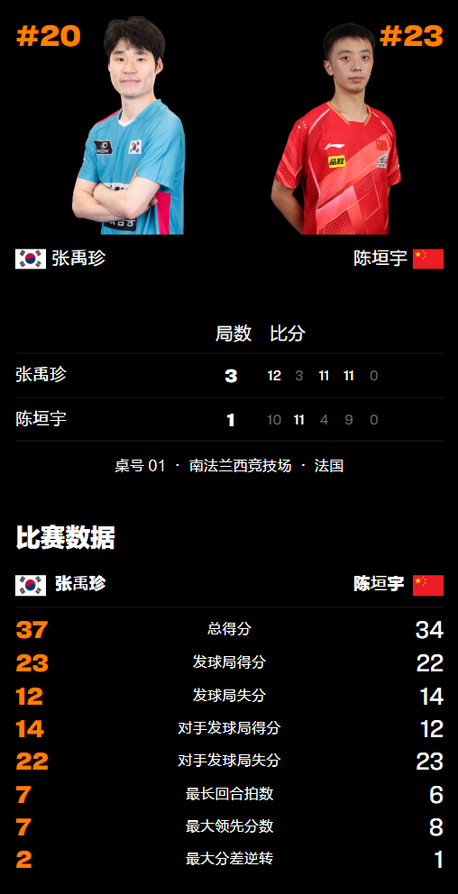 陈垣宇出生于2005年,目前排名世界第23位;张禹珍出生于1995年,最新排世界第20名——两人的位置比较接近,但一个是刚冒头不久的希望之星,一个是成名已久的老将,打法风格也大相径庭,此前仅有过1次交手,结果是陈垣宇0-3败北、但每局都只输2分。