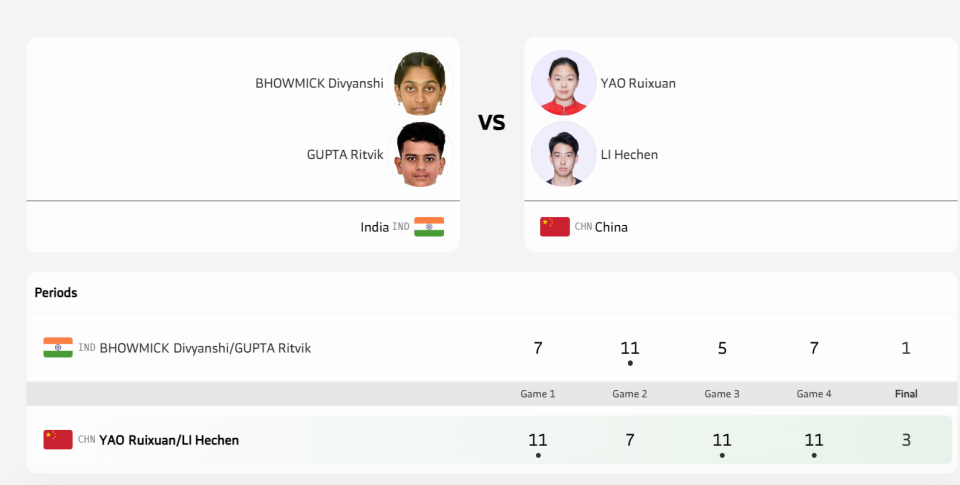 李和宸/姚睿轩3-1击败古普塔/博米克【11-7、7-11、 11-5、11-7】;