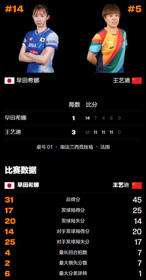 在此之前,两位运动员曾经有过5次交手,王艺迪3胜2负、且在最近的对决中胜出,但在世锦赛、亚运会这样的重要场合败给早田希娜,如今又在队友4连败的情况下登场,压力之大可想而知。