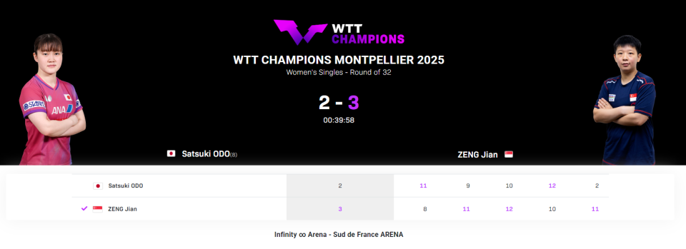 大藤沙月作为本站赛事的女单卫冕冠军,同样遭遇一轮游,2-3不敌新加坡选手曾尖,决胜局曾尖强势轰出11-2的悬殊比分,直接打崩了大藤沙月!