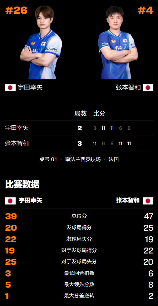 就交手记录而言,宇田幸矢仅在日本国内比赛中赢过张本智和,国际比赛3次对决全部落败,如今再次相遇普遍也更看好张本智和能获得晋级。
