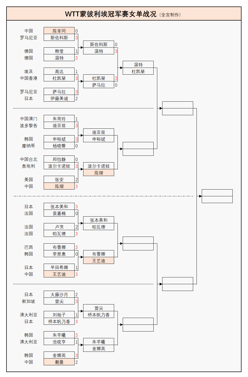 女单方面,国乒在2大奥运冠军孙颖莎、王曼昱退赛后也遭遇重创,2大主力陈幸同、蒯曼分别败给罗马尼亚的斯佐科斯、韩国的金娜英,剩余王艺迪、陈熠2人继续前进,其余被淘汰的世界冠军名将还有中国澳门的朱雨玲(输波多黎各的迪亚兹)、日本的伊藤美诚(输罗马尼亚的萨马拉)。