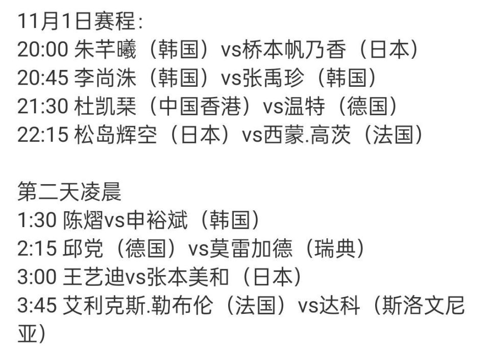 按照11月1日赛程,八场比赛分成两个阶段进行,早场是朱芊曦vs桥本帆乃香、张禹珍vs李尚洙、温特vs杜凯琹、松岛辉空vs西蒙.高茨,朱芊曦能否战胜桥本帆乃香要看会不会处理削球,张禹珍和李尚洙实力接近,队友之间全看临场发挥,杜凯琹这场有难度,温特属于特殊打法不容小觑。