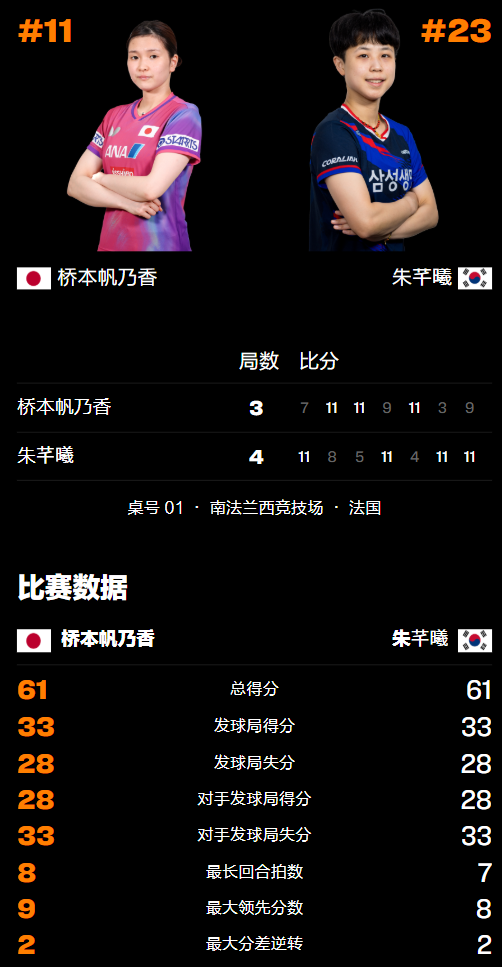 比赛开始后,桥本帆乃香进入状态偏慢,很快便0-4、2-8落后比分,紧接着增加削中反攻的威胁追分打乱朱芊曦追至6-9,随后6-10挽救1个局点但未能实现逆转,最终以7-11败北先丢一局,未能在旋转变化上打乱对手。